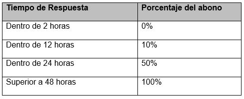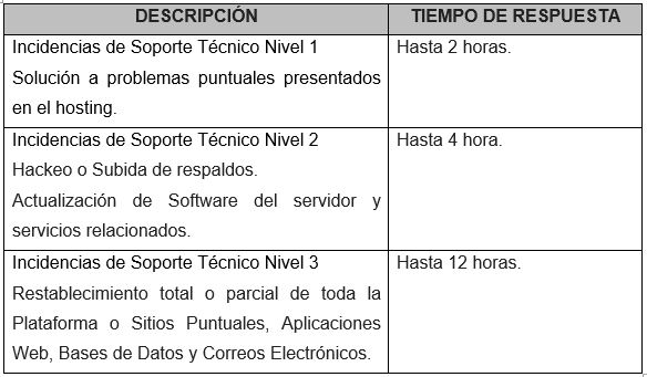 Nuestro tiempo de respuesta a incidencias de Soporte Técnico se describen en el siguiente cuadro. Una vez que el incidente es reportado por el cliente desde uno de los correos autorizados y mediante uno de los canales indicados anteriormente en el capítulo generalidades.