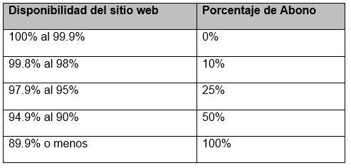 En el caso de que la disponibilidad media de todos sus sitios web (Alojados en PROMEHOST) sea inferior al 99.99% mensual, Promehost abonará un crédito a favor del cliente y/o usuario al mes o al año siguiente (dependiendo del contrato de hosting) del porcentaje correspondiente al valor mensual o anual del contrato de alojamiento tomando en cuenta la siguiente tabla: